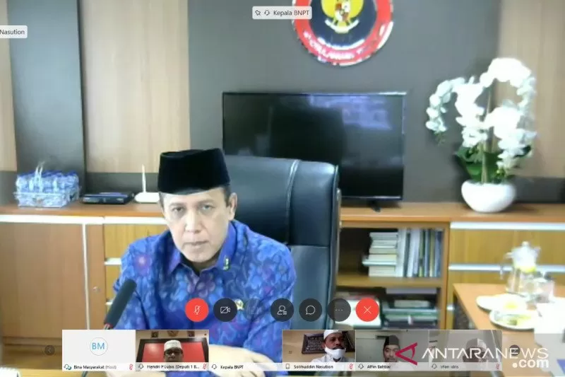 Kepala Badan Nasional Penanggulangan Terorisme (BNPT) Boy Rafli Amar saat membuka acara silaturahim dan halal bihalal bersama para mantan napiter dan kombatan (Mitra) BNPT yang dilakukan melalui video conference. (HO)