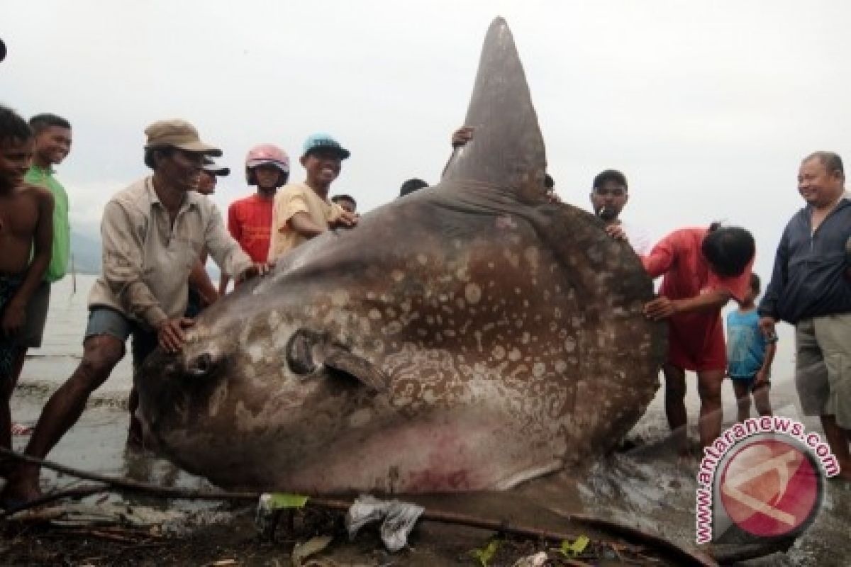 Palu (antara) - Seekor ikan mola-mola (hypopthalmichtys molitrix) seukuran kerbau yang terdampar di pinggirian Teluk Palu di Kota Palu, Sulawesi Tengah, Selasa, menghebohkan ratusan warga untuk melihatnya.