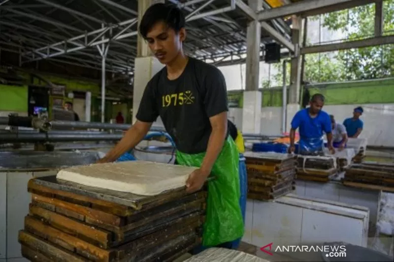 Pekerja mencetak adonan tahu di usaha pembuatan tahu Afifah di Kelurahan Nunu, Palu, Sulawesi Tengah, Selasa (23//6/2020). Selain menjual secara konvensional, UMKM tersebut juga menyiasati kondisi pandemi COVID-19 guna mempertahankan kelangsungan usaha dengan melakukan diversifikasi produk tahu dan menjualnya secara daring. ANTARAFOTO/Basri Marzuki/hp.