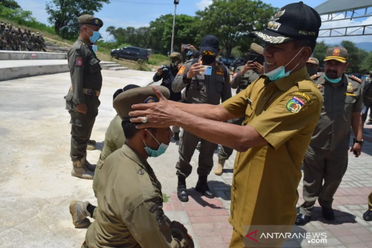 Wali Kota Palu, Hidayat menyamatkan secara simbolis baret kepada salah seorang personel Satuan Polisi Pamong Praja (Satpol-PP) Kita Palu, Sulawesi Tengah yang telah selesai mengikuti pembaretan, Selasa (22/9/2020). ANTARA/HO/Humas Pemkot Palu