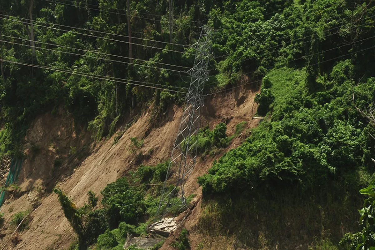 Satu tower transmisi pengantar listrik tegangan tinggi milik Perusahaan Listrik Negara (PLN) nyaris roboh di atas tebing pada jalur Toboli-Tawaeli atau kebun kopi kilometer 10, Jumat (2/9/2020). Tower tersebut tampak miring akibat tebing di sekitarnya longsor. Transmisi itu juga menghantar listrik tegangan tinggi dari Palu ke Gardu Induk (GI) Binangga, Parigi untuk memenuhi pasokan listrik di Kabupaten Parigi Moutong. ANTARA/Moh Ridwan