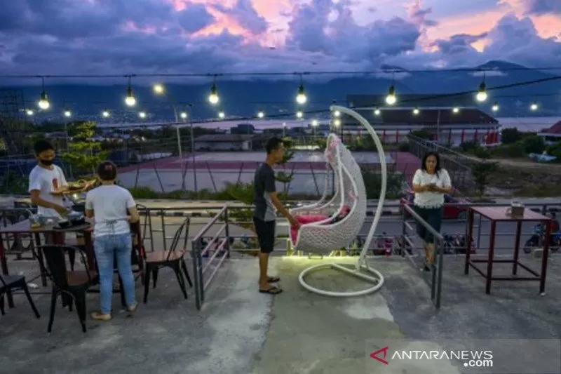 Sejumlah pengunjung menikmati suasana di salah satu kafe yang baru dibuka di Palu, Sulawesi Tengah, Sabtu (7/11/2020). Meskipun sempat lesu karena pembatasan sosial akibat pandemi COVID-19, pemerintah setempat memberi izin kembali usaha kafe baik yang lama maupun yang baru untuk beroperasi dengan tetap menerapkan protokol kesehatan. ANTARA FOTO/Basri Marzuki/wsj.