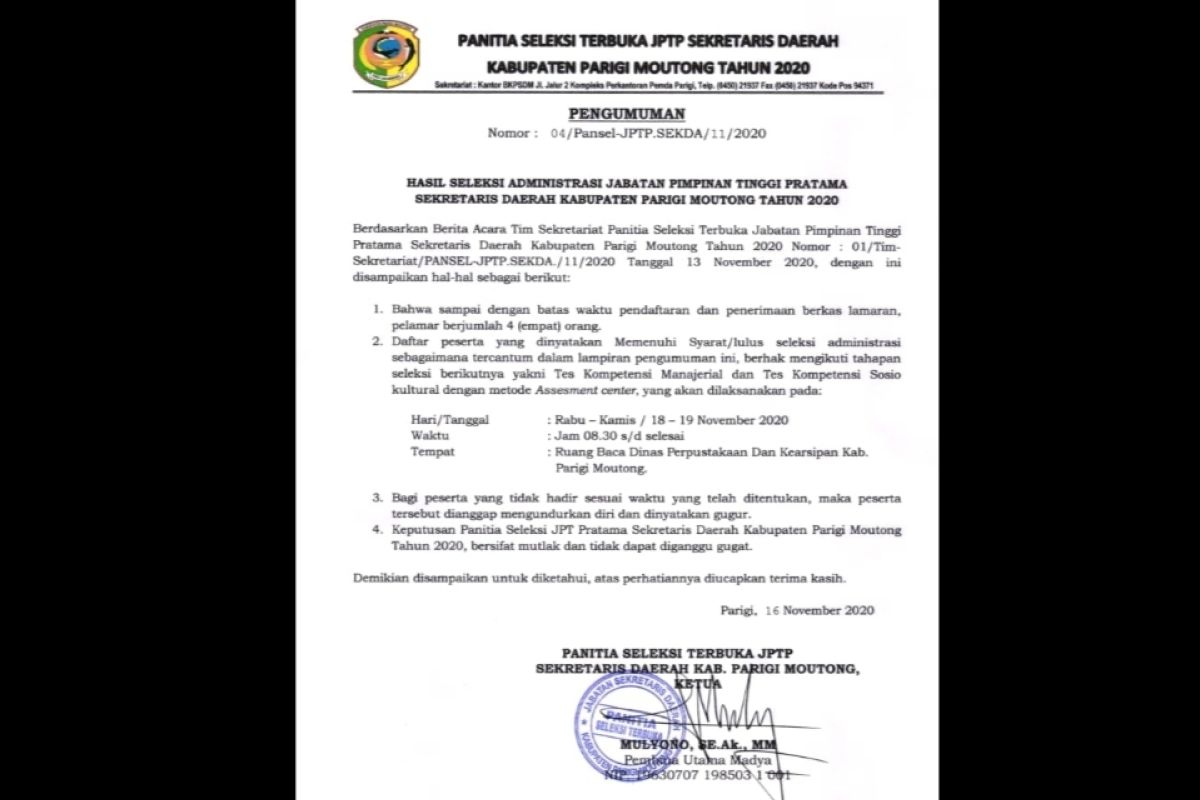 "Daftar peserta yang dinyatakan memenuhi syarat/lulus seleksi administrasi sebagaimana tercantum dalam lampiran, berhak mengikuti tahapan seleksi berikutnya, yakni tes kompetensi manajerial dan tes kompetensi sosio-kultural dengan metode 'assesment center' yang dilaksanakan 18-19 November, di Parigi," ungkapnya.