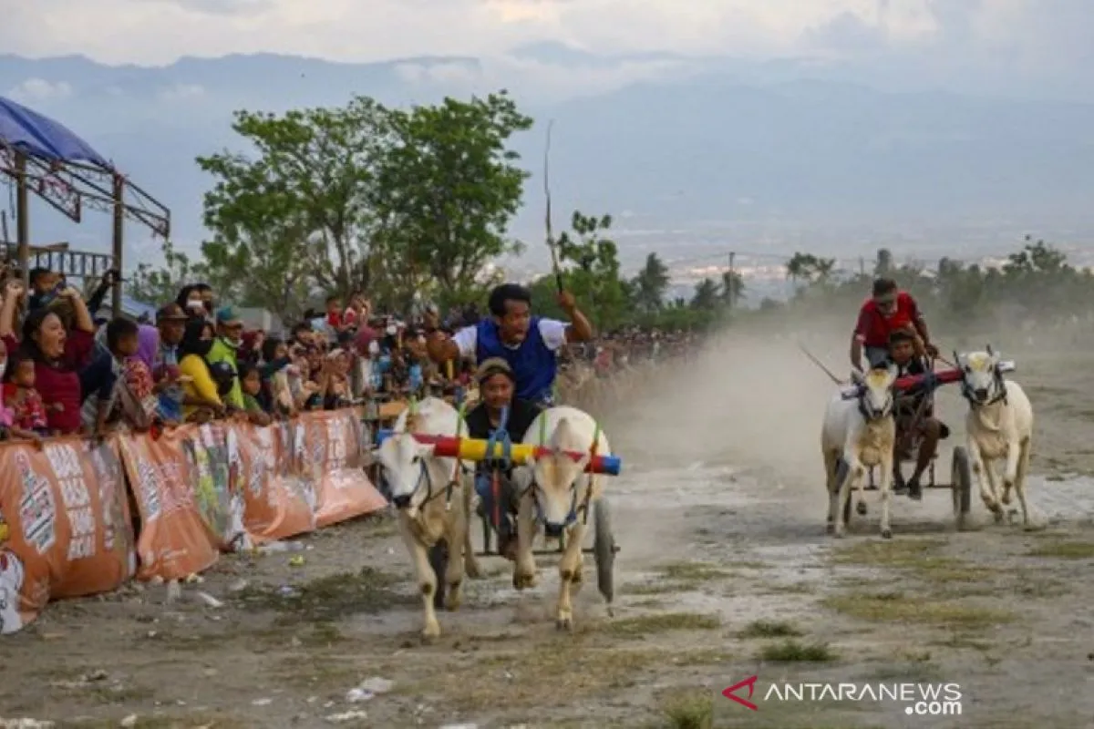 Sejumlah peserta memacu sapinya saat lomba karapan sapi di Desa Baliase, Kabupaten Sigi, Sulawesi Tengah, Jumat (13/11/2020). Sudah menjadi tradisi warga di desa itu pada setiap usai panen raya menggelar lomba karapan sapi sebagai sarana mempererat silaturahim dan ungkapan rasa syukur atas hasil panen. ANTARA FOTO/Basri Marzuki/wsj.