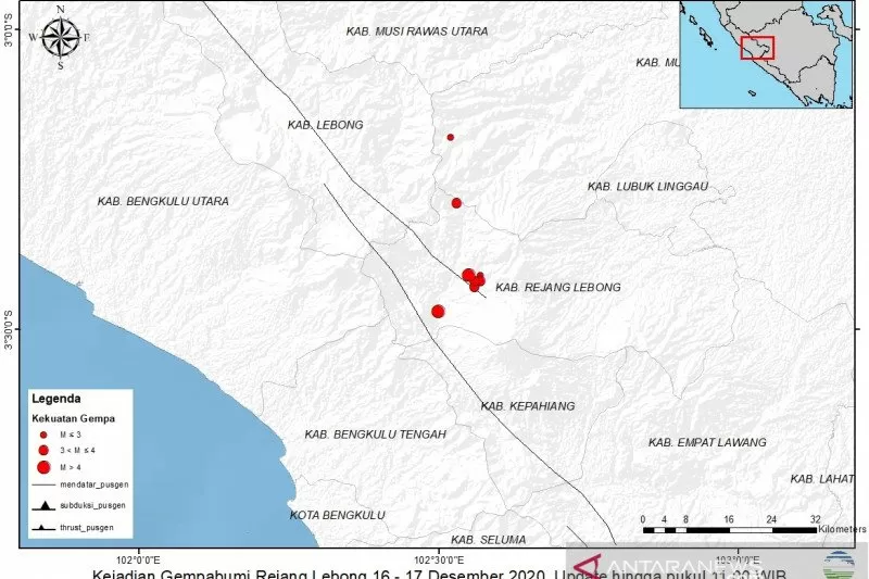 Jakarta (ANTARA) - Rentetan gempa tektonik jenis gempa kerak dangkal (shallow crustal earthquake) mengguncang wilayah Curup, Rejang Lebong, Bengkulu sejak Rabu (16/12) dan terus berlanjut hingga Kamis (17/12).