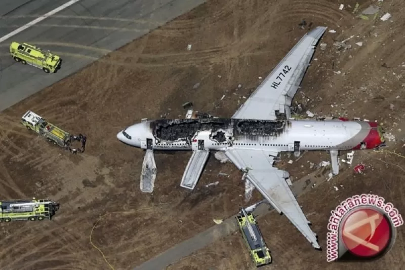 Pesawat Boeing 777 milik Asiana Airlines jatuh saat mendarat di Bandara Internasional San Francisco, Amerika Serikat, Sabtu (6/7). (REUTERS/Jed Jacobsohn)