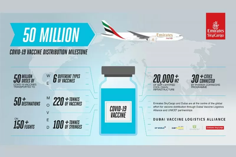 Sejak dimulainya distribusi internasional pada akhir tahun lalu, Emirates SkyCargo telah mengangkut lebih dari 220 ton vaksin COVID-19, setara dengan lebih dari 50 juta dosis, dengan lebih dari 150 penerbangan dari lokasi manufaktur ke 50 tujuan dalam jaringannya melalui Dubai.