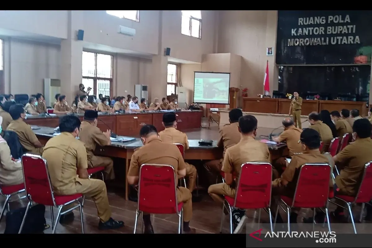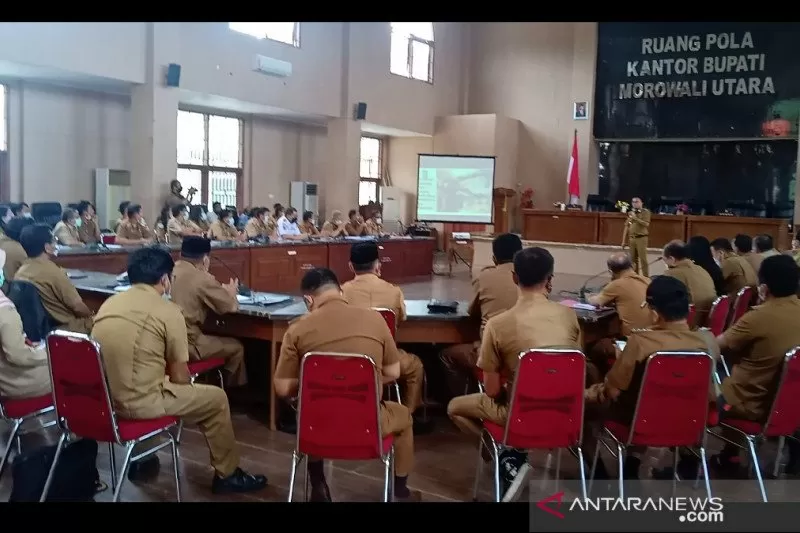 Bupati Morut Delis J. Hehi menguraikan visi misinya memimpin Morutpada rakor perdana dengan semua kepala OPD, pada hari kedua menjadi bupati di ruang pola kantor Bupati Morut di Kolonodale, Selasa (4/5) (Antaranews.com/Rolex Malaha)