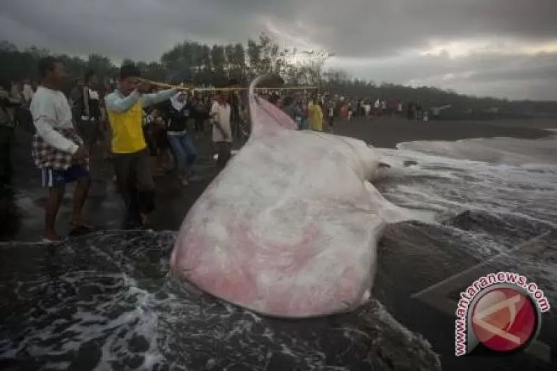 Ikan Paus terdampar di Bantul, Yogyakarta, Kamis (2/8). (FOTO ANTARA/Sigid Kurniawan)