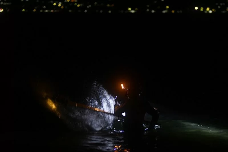 Nelayan tradisional memancing perhatian udang kecil dengan cahaya senter dan ditangkap dengan menggunakan jaring di Pantai Teluk Palu, Sulawesi Tengah, Selasa (12/10/2021). Udang hasil tangkapan tersebut sebagian besar dijual kepada pemancing ikan yang menggunakannya sebagai umpan dan setiap nelayan udang mampu menghasilkan Rp50 ribu hingga Rp100 ribu dalam sekali melaut. ANTARA/Mohamad Hamzah.