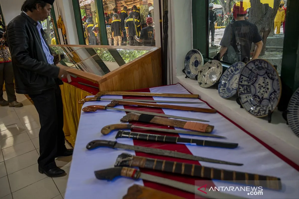 Warga memerhatikan aneka senjata tradisional yang dipajang di Museum Senjata Tradisional yang baru dibuka di Palu, Sulawesi Tengah, Rabu (10/11/2021). Museum yang pendiriannya diprakarsai Danrem 132/Tadulako itu memiliki lebih dari 80 koleksi Guma dari berbagai wilayah dan diharapkan akan menjadi sarana edukasi bagi generasi muda dan pelestarian warisan budaya warga setempat. ANTARA/Basri Marzuki