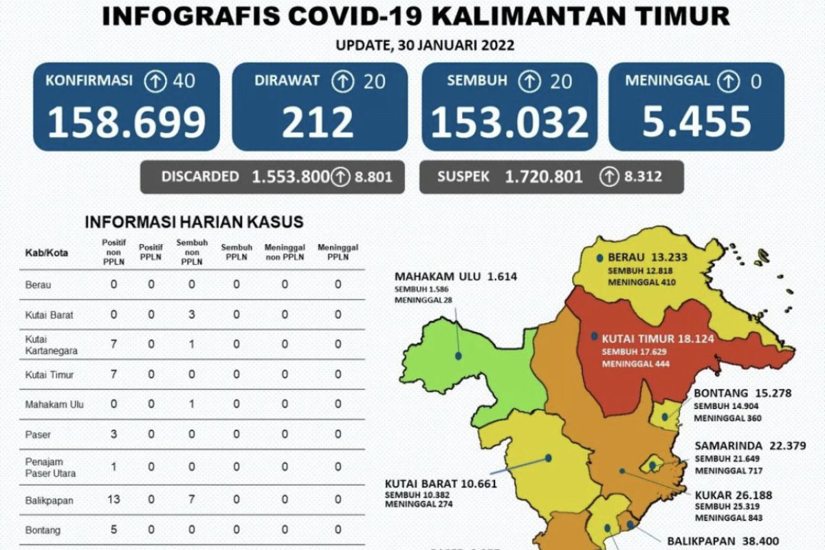 Berdasarkan akumulasi kasus terkonfirmasi positif COVID-19 di Kaltim sebanyak 158.699 kasus, yang telah dinyatakan sembuh sebanyak 153.032 kasus, dan meninggal dunia sebanyak 5.455 kasus.