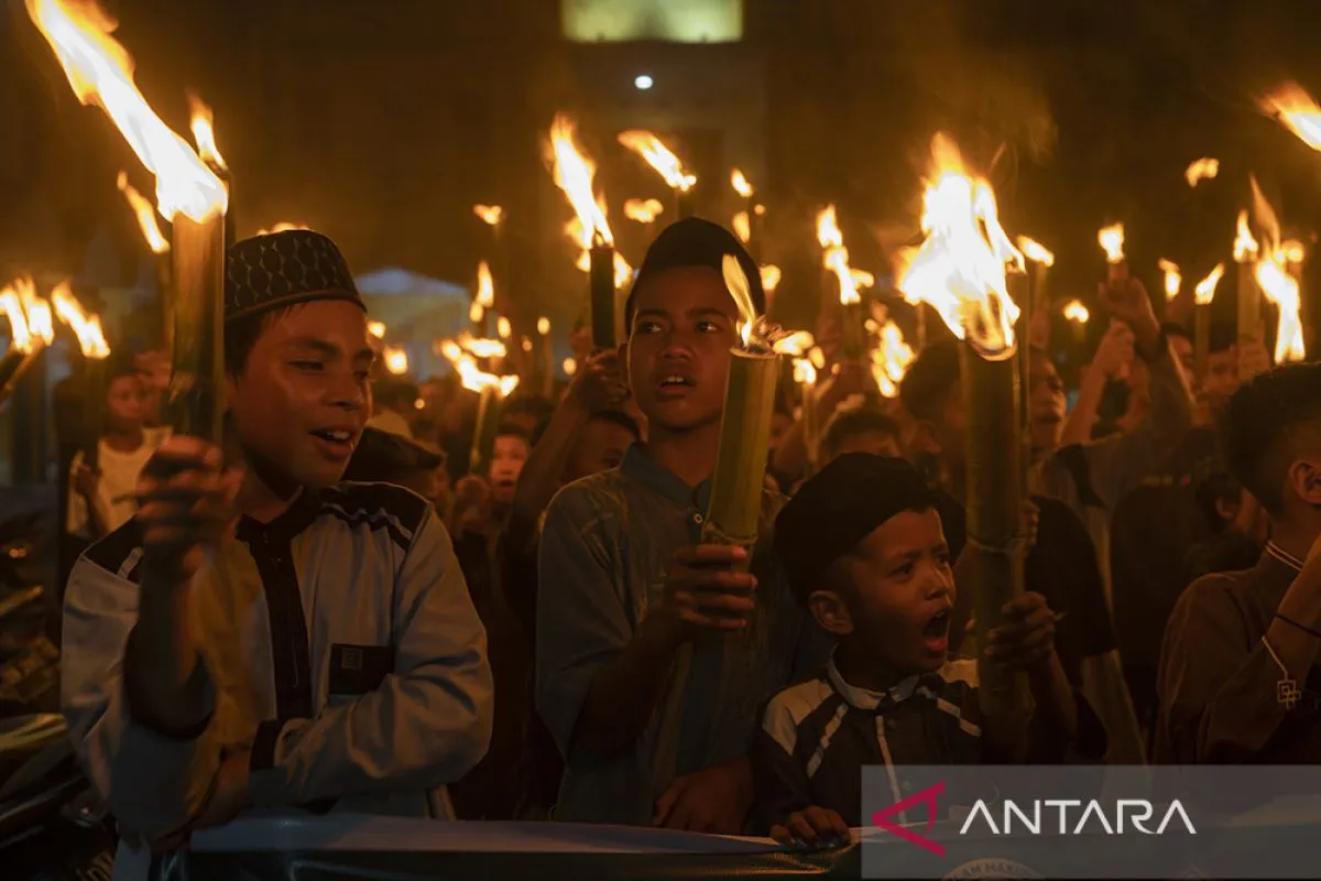 Sejumlah anak yang tergabung dalam Aliansi Remaja Masjid (Risma) dan Pemuda Tavanjuka menggemakan takbir sambil pawai obor di Kelurahan Tavanjuka, Palu, Sulawesi Tengah, Minggu (1/5/2022) malam. Takbir keliling dan pawai obor itu untuk menyambut lebaran Idul Fitri 1443 yang jatuh pada 2 Mei 2022. ANTARA/asri Marzuki