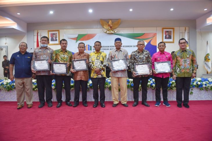 Gubernur Sulteng Rusdy Mastura (kelima kanan) dan Kepala Kanwil KPN Provinsi Sulteng Irfa Ampri (kiri) bersama para pimpinan daerah dan lembaga vertikan yang menerima penghargaan Kementerian Keuangan Satu Sulteng (K1S) Awards Tahun 2022 di Palu, Kamis (3/11/2022). ANTARA/Rolex Malaha