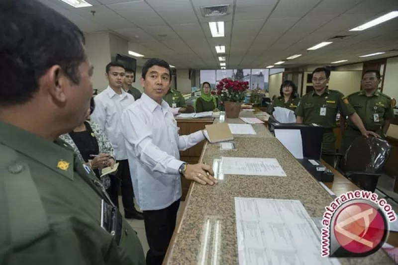 Menteri PAN dan RB Yuddy Chrisnandi (ketiga kiri) bertanya kepada sejumlah pegawai ketika sidak ke Kantor Walikota Jakarta Barat, Senin (4/1). (ANTARA FOTO/Widodo S. Jusuf)