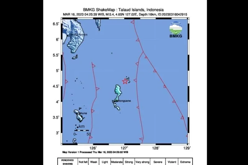 Daryono menyampaikan, gempa yang terjadi pada Kamis, 16 Maret 2023 pukul 04.25.39 WIB itu menimbulkan guncangan di daerah Nanusa, Kepulauan Talaud dengan skala intensitas IV-V (Modified Mercally Intensity), artinya getaran dirasakan hampir semua penduduk, orang banyak terbangun.