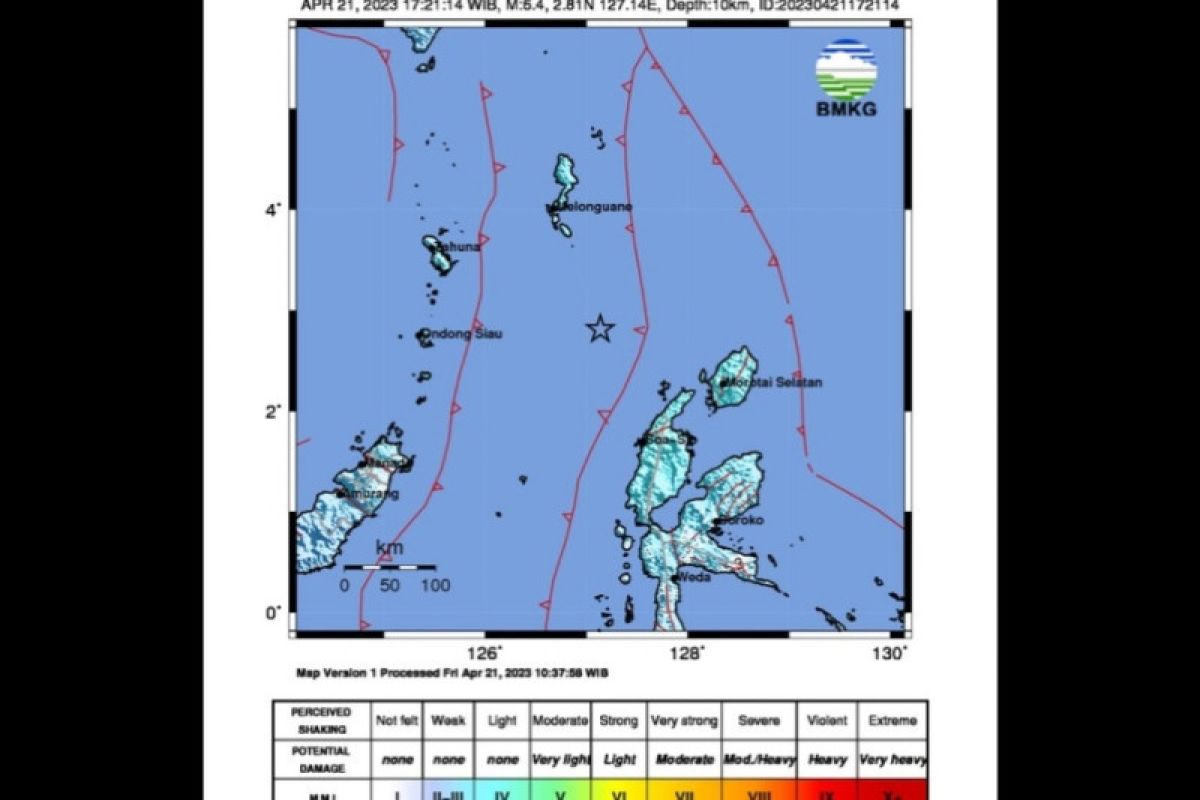 Daryono menyampaikan bahwa gempa bumi yang terjadi pada Jumat, 21 April 2023 pukul 17.21.14 WIB itu berdampak dan dirasakan di daerah Morotai Selatan, Galela, Tobelo dengan skala intensitas III MMI (Modified Mercally Intensity), artinya getaran dirasakan nyata dalam rumah, terasa getaran seakan-akan truk berlalu.