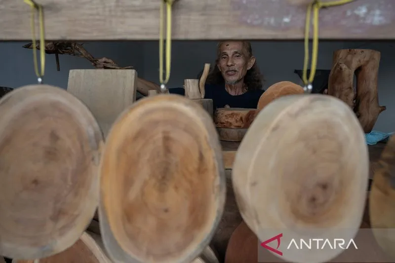 Perajin kayu batangan (log) Arman Revi menata aneka perabot rumah tangga yang terbuat dari kayu Mahoni (Swietenia Mahagoni) hasil produksinya di Palu, Sulawesi Tengah, Jumat (28/7/2023). Kerajinan kayu log yang sebagian besarnya memanfaatkan sisa hasil tebangan dan peremajaan pohon pelindung dalam kota itu dijual dengan kisaran harga antara Rp35 ribu untuk perabot kecil dan mencapai Rp7 juta untuk meja panjang. ANTARA/Basri Marzuki