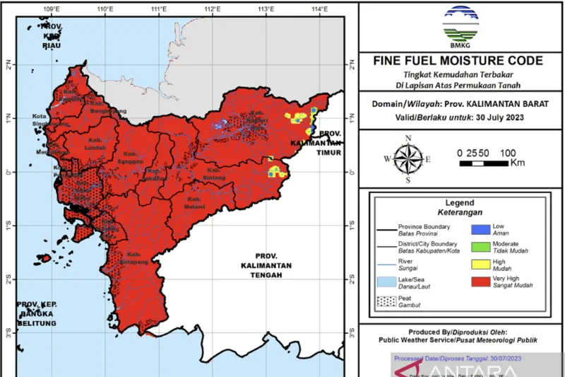 "Berdasarkan pantauan sebaran titik panas di Kalbar tanggal 29 Juli 2023 dari sensor VIIRS dan MODIS pada satelit Polar memberikan gambaran lokasi wilayah yang mengalami kebakaran hutan dan lahan, di mana terpantau sebanyak 1.985 titik panas yang tersebar di seluruh wilayah Kalbar," kata Koordinator Bidang Data dan Informasi BMKG Stasiun Meteorologi Kelas I Supadio, Pontianak, Sutikno dihubungi di Sungai Raya, Minggu.