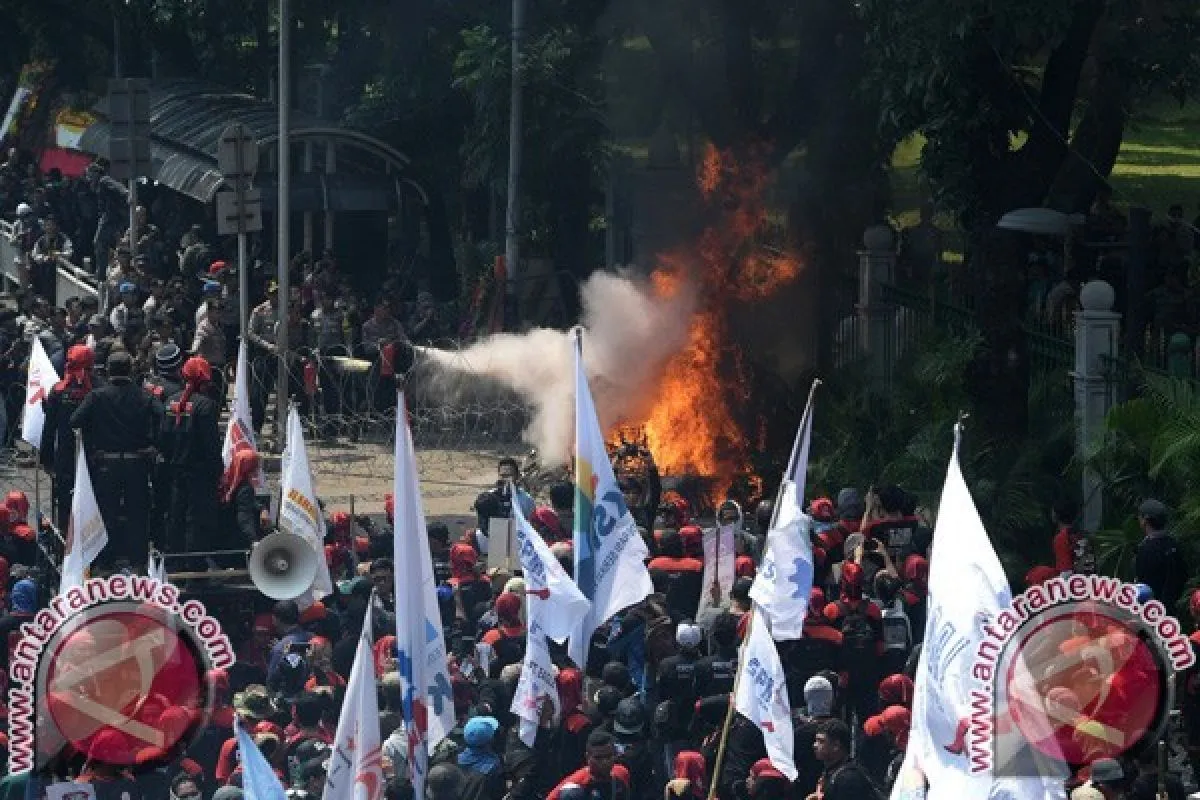 Aparat keamanan memadamkan karangan bunga yang dibakar pendemo saat berlangsung aksi Hari Buruh Sedunia pada 1 Mei (May Day) di Jalan Medan Merdeka Barat, Jakarta, Pusat, Senin (1/5/2017). ( ANTARA FOTO/Sigid Kurniawan)