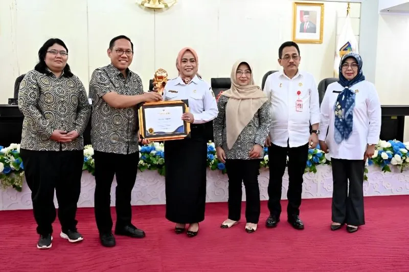 Octovianus Ramba menyerahkan penghargaan UHC secara langsung kepada Sekretaris Daerah Provinsi Sulteng Novalina pada kegiatan forum komunikasi Pemprov Sulteng.