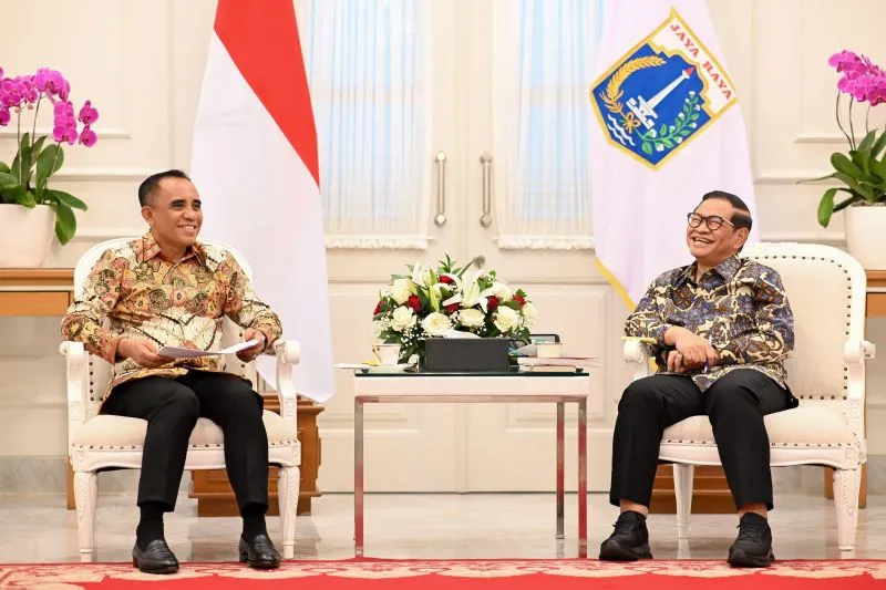 Gubernur Sulteng Anwar Hafid (kiri) bertemu Gubernur DKI Jakarta Pramono Anung (kanan) di Balaikota DKI Jakarta, Rabu (6/8/2025). (ANTARA/HO-Humas Pemprov Sulteng)