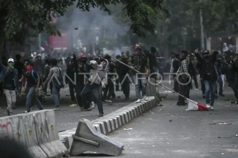 Pengunjuk rasa melempar batu ke arah polisi saat unjuk rasa di kawasan perempatan Petamburan, Jakarta, Kamis (28/8/2025). ANTARA FOTO/Hafidz Mubarak A/bar.