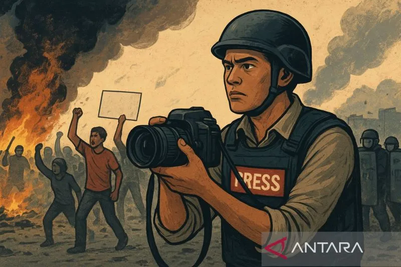 Ilustrasi yang dibuat dengan kecerdasan buatan (AI) tentang kebebasan pers dalam peliputan. (ANTARA/Aprillio Akbar)