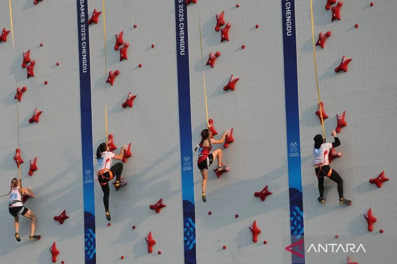 Atlet panjat tebing Indonesia Desak Made Rita Kusuma (kedua kiri) memacu kecepatan bersama atlet panjat tebing Polandia Natalia Kalucka (kiri), atlet panjat tebing China Yu Mei Qin (kedua kanan) dan atlet panjat tebing Indonesia Rajiah Sallsabillah (kanan) saat bertanding pada Final Panjat Tebing Wanita Speed Single 4 di World Games 2025 di Chengdu, Provinsi Sichuan, China, Jumat (15/8/2025). Desak Made Rita Kusuma meraih emas dalam pertandingan final nomor Single Speed 4 putri dengan catatan waktu 6,35 detik sementara Yu Mei Qin meraih perak dengan catatan waktu 6,42 detik dan Rajiah Sallsabillah meraih perunggu dengan catatan waktu 6,951 detik. ANTARA FOTO/Xinhua/Chen Cheng/agr