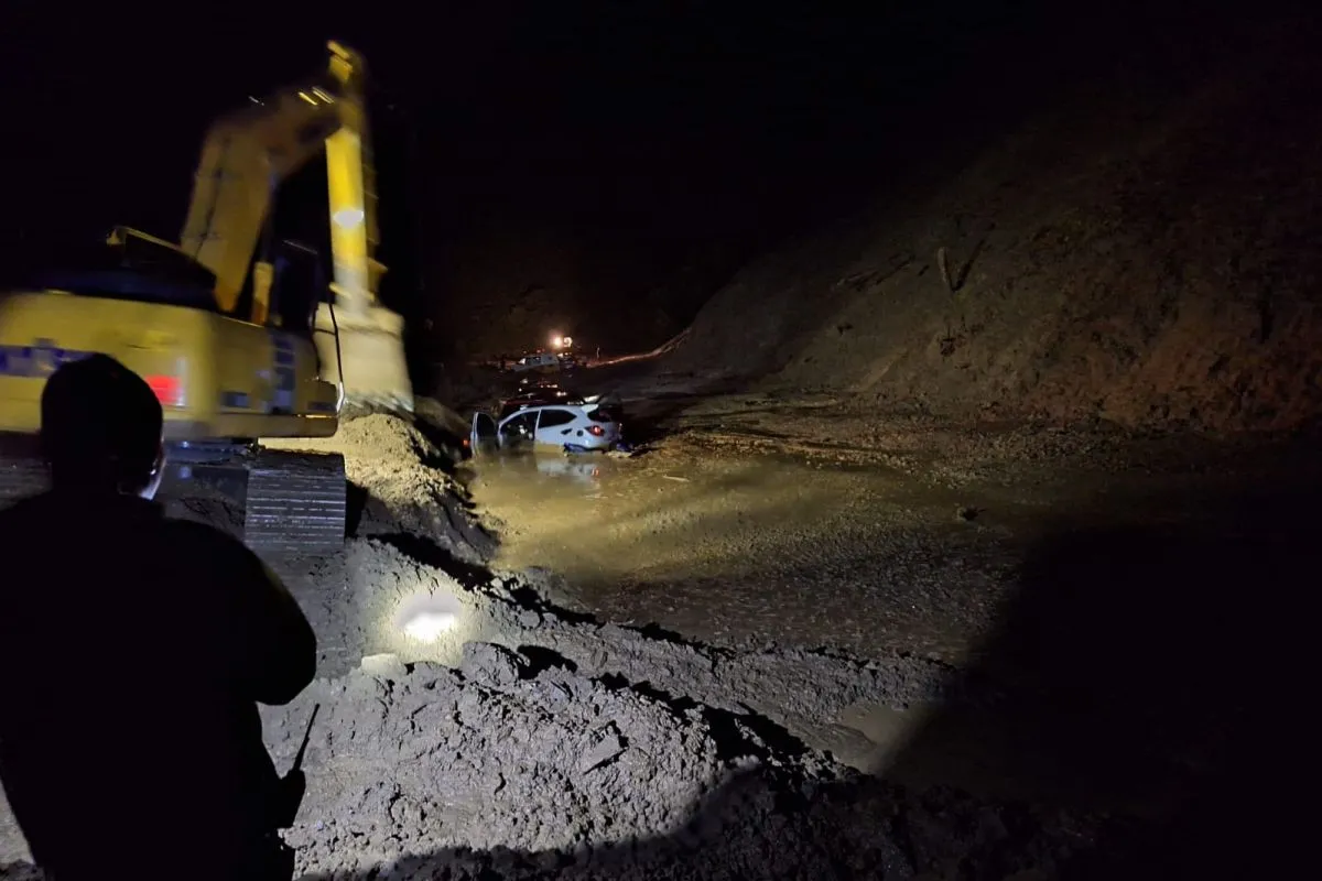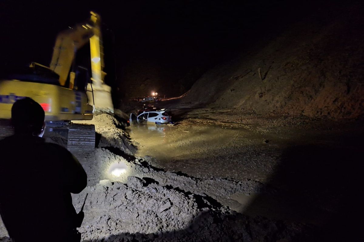 Sejumlah kendaraan tertimbun longsor di Jalur Kebun Kopi, Jalan Trans Sulawesi arah Kota Palu menuju Kabupaten Parigi Moutong, Sulawesi Tengah, Kamis malam.