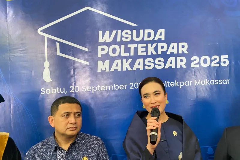 Menteri Pariwisata Widiyanti Putri Wardhana didampingi Wali Kota Makassar Munafri Arifuddin pada Wisuda Poltekpar Makassar di Makassar, Sabtu (20/09/2025). (ANTARA/Nur Suhra Wardyah)