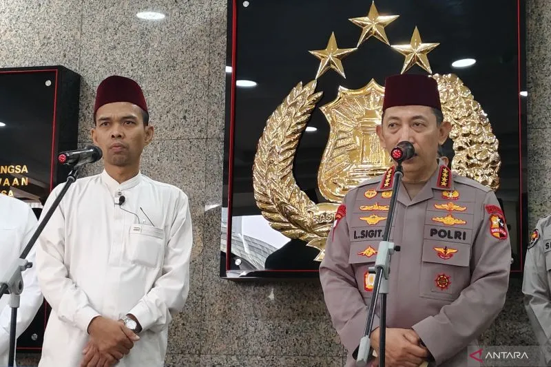Kapolri Jenderal Pol. Listyo Sigit Prabowo (kanan) bersama Ustaz Abdul Somad Batubara (kiri) memberikan keterangan pers di Gedung Rupattama Mabes Polri, Jakarta, Jumat (26/9/2025). (ANTARA/Nadia Putri Rahmani)