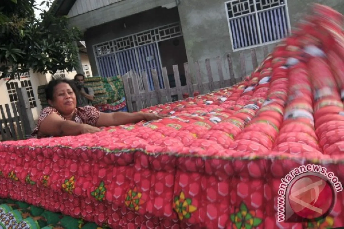 Seorang ibu menumpuk kasur dari bahan kapuk hasil buatannya di Desa Dalaka, Kec. Sindue, Kab. Donggala, Sulteng, Minggu (29/4). Harga kasur kapuk itu naik hingga 50 persen bahan baku didatangkan dari daerah luar akibat tidak tersedianya kapuk lokal. (ANTARA Sulteng/Basri Marzuki)
