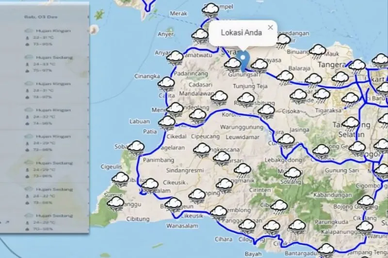 Beralih ke Pulau Jawa, BMKG memprakirakan hujan ringan berpotensi terjadi di Serang, Jakarta, Bandung, dan Surabaya. Adapun hujan dengan intensitas sedang diprakirakan terjadi di Semarang, sedangkan Yogyakarta diprediksi mengalami kondisi berawan tebal.