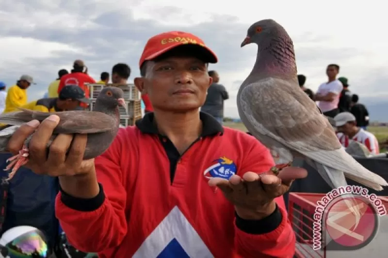Seorang penghobi merpati balap memperlihatkan sepasang merpati andalannya saat latihan di lokasi penggaraman Pantai Talise, Kota Palu, Sulawesi Tengah, Minggu (1/12). Sejumlah penghobi merpati di kota ini rutin melatih jagoannya jelang perlombaan merpati balap antarkelompok tingkat regional yang akan diselenggarakan oleh Persatuan Penggemar Merpati Balap Sprint Indonesia (PPMBSI) Sulawesi Tengah, akhir Desember 2013.(FOTO ANTARASulteng/M Taufan SP Bustan/13)