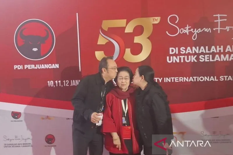 Ketua Umum DPP PDIP Megawati Soekarnoputri (tengah) dicium Ketua DPP PDIP Prananda Prabowo (kanan) dan Ketua DPR RI Puan Maharani (kiri) saat Rakernas I 2026 PDIP di Ancol, Jakarta, Minggu (11/1/2025). (ANTARA/Bagus Ahmad Rizaldi)