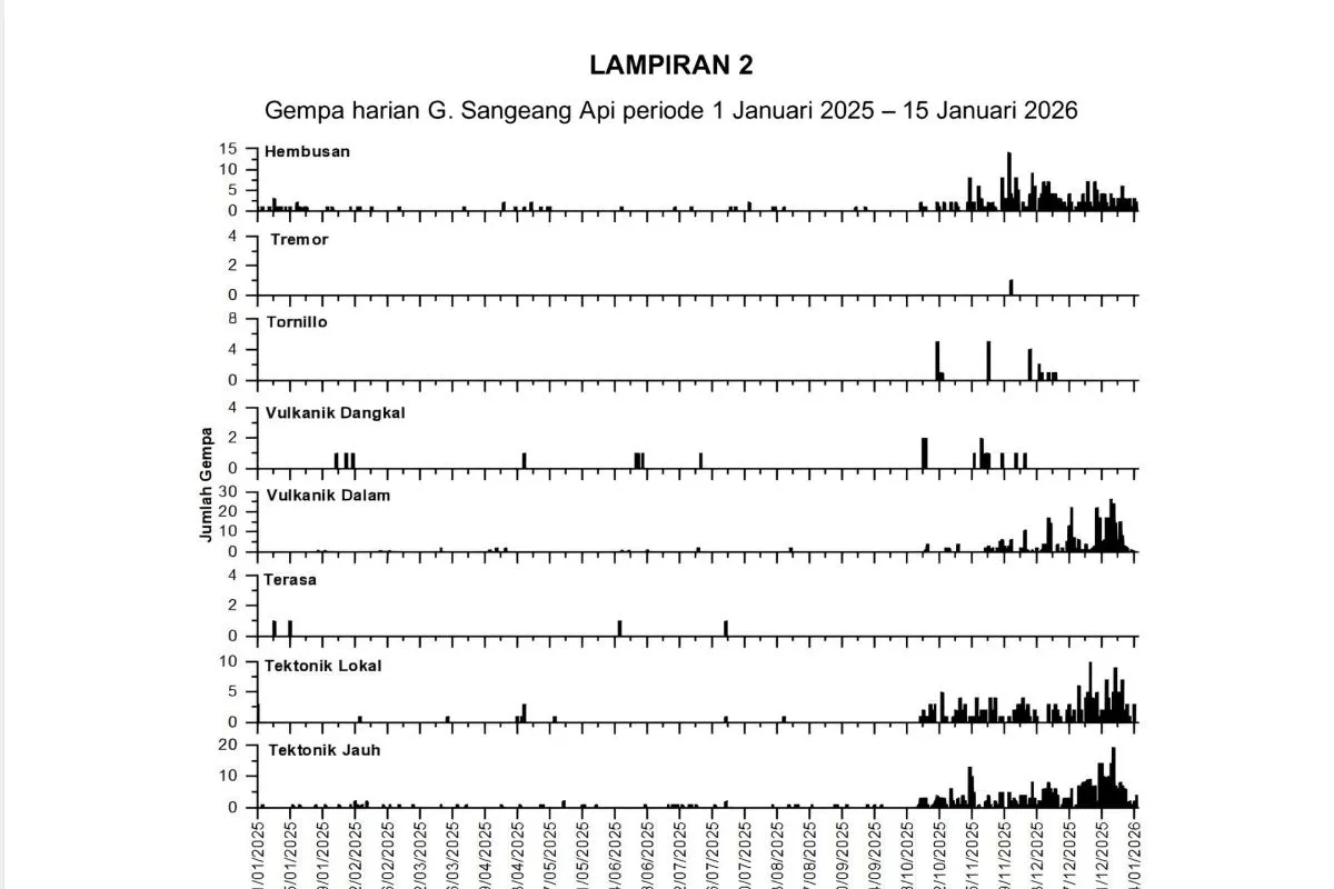 Pada 1-15 Januari 2026, Badan Geologi mencatat ada 40 kali gempa hembusan, 139 kali gempa vulkanik dalam, 51 kali gempa tektonik lokal, dan 106 kali gempa tektonik jauh.