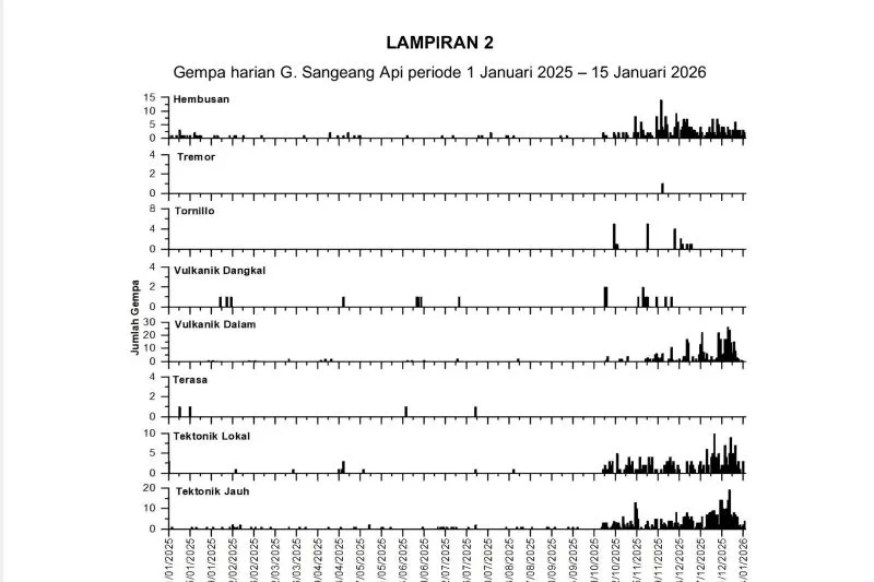 Mataram (ANTARA) - Badan Geologi melaporkan ada peningkatan aktivitas kegempaan vulkanik dalam di Gunung Sangeang Api, Kabupaten Bima, Nusa Tenggara Barat (NTB) selama periode terbaru pada 1-15 Januari 2026.