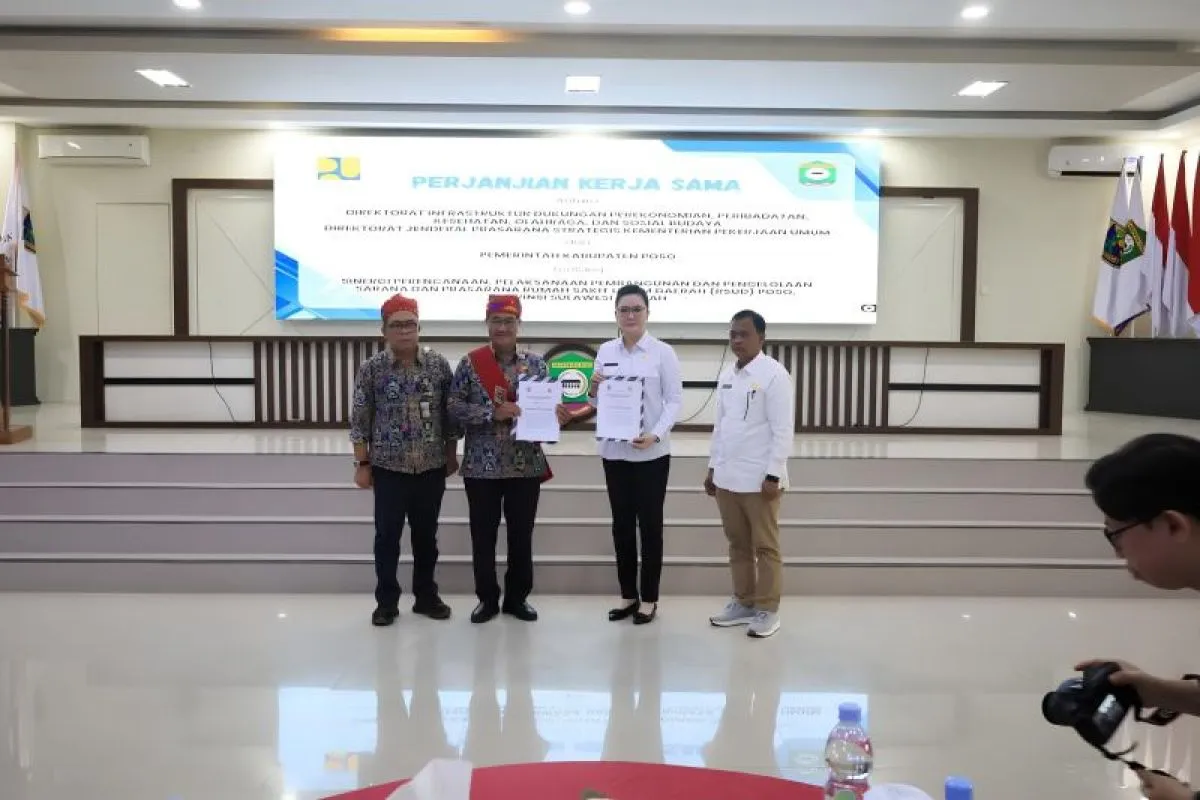 Bupati Poso Verna G.M. Inkiriwang dan Direktur Infrastruktur Dukungan Perekonomian, Peribadatan, Kesehatan, Olahraga, dan Sosial Budaya Ditjen Prasarana Strategis Kementerian Pekerjaan Umum Tanozisochi Las melakukan penandatanganan Perjanjian Kerja Sama (PKS) pembangunan Rumah Sakit Umum Daerah (RSUD) Poso yang baru.
