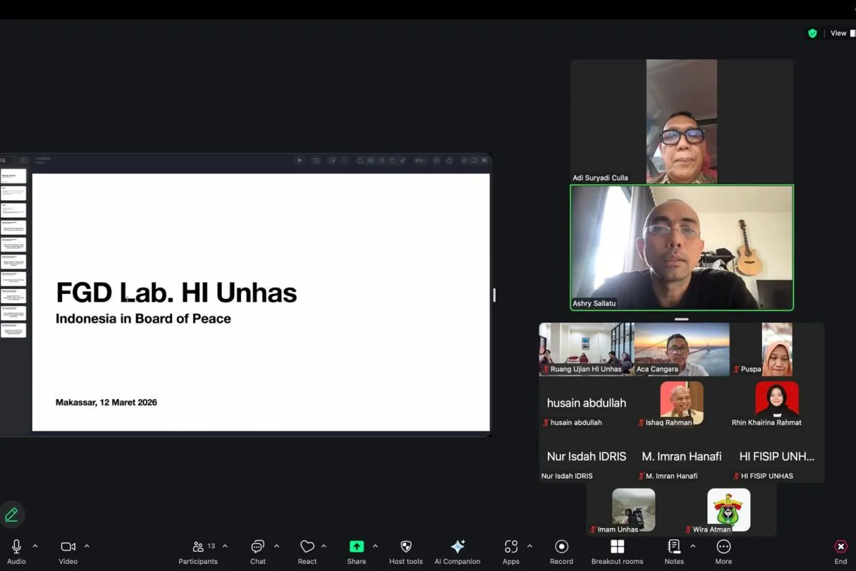 Dalam laporan hasil kajian FGD yang disebarkan kepada publik di Makassar, Sabtu, Laboratorium HI Unhas memandang keterlibatan Indonesia di BoP harus dievaluasi kembali dan diakhiri karena badan tersebut tidak secara nyata menunjukkan keberpihakan yang menguntungkan Palestina.
