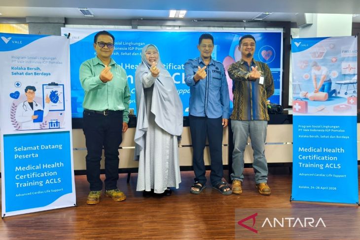 PT Vale Indonesia Tbk IGP Pomalaa bersama Kepala Dinkes Kolaka dan Plt Direktur RSUD Benyamin Guluh foto bersama saat memberikan training ALCS untuk tenaga medis di Kolaka, Sulawesi Tenggara. (ANTARA/La Ode Muh Deden Saputra/Andika)