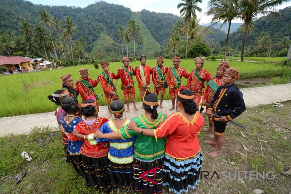 Sejumlah warga suku Kulawi sub etnis Uma memainkan tari Raego di lembah Pipikoro, Desa Banasu, Kabupaten Sigi, Sulawesi Tengah, Minggu (9/9). Tari Raego adalah tari khas suku tersebut yang dimainkan bersama pria dan wanita sambil menyanyikan lagu pujian yang dimainkan pada kegiatan adat. ANTARASulteng/Basri Marzuki/18