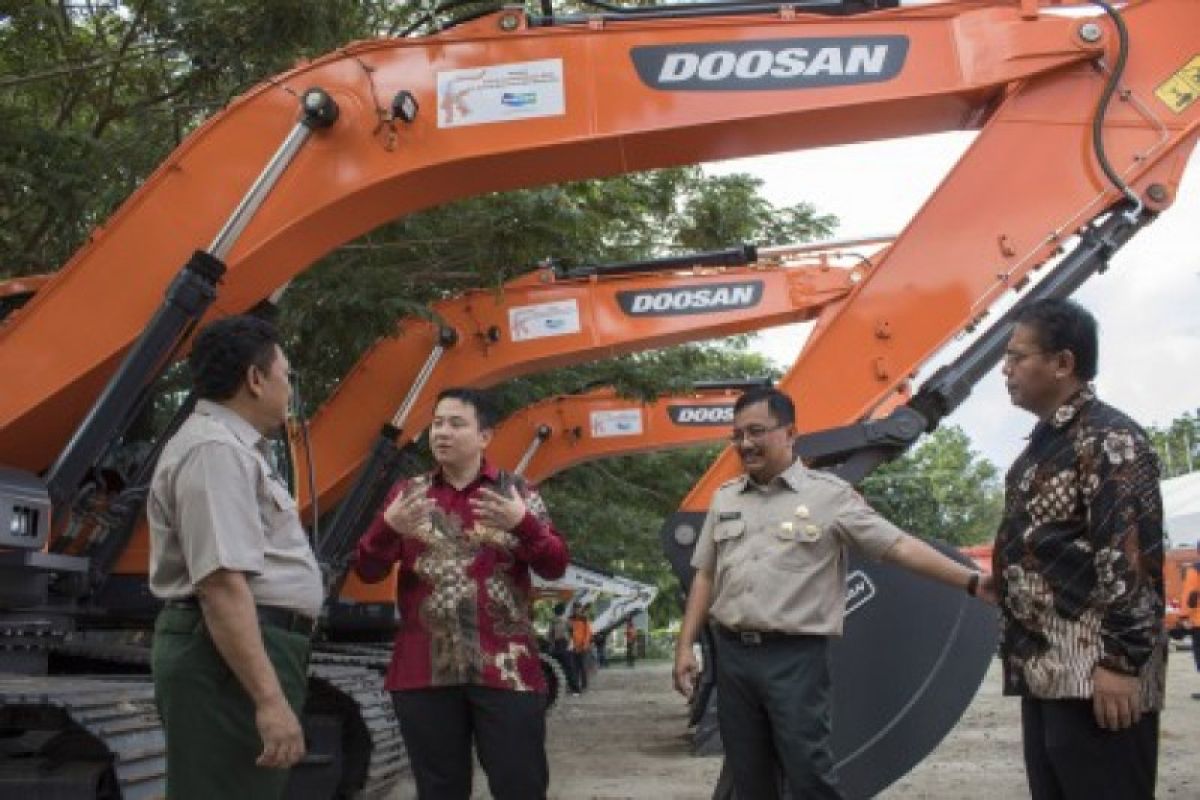 Dari kiri ke kanan; Direktur Peralatan BNPB Rustian, Direktur Penjualan PT Kobexindo Tractors William Jonathan, Deputi Bidang Logistik dan Peralatan Rudi Patmanto, dan Wakil Direktur Penjualan dan Pemasaran PT Kobexindo Tractors Aluqri Sagitri Putra berbincang usai menyerahkan bantuan hibah alat berat di Palu, Sulawesi Tengah, Kamis (20/12/2018). Doosan Heavy Industries Korea Selatan melalui mitranya di Indonesia Kobexindo Tractors Tbk memberikan bantuan hibah delapan unit excavator kepada BNPB untuk mempercepat proses pemulihan infrastuktur di Palu, Sigi, dan Donggala yang terdampak bencana. ANTARA FOTO/Basri Marzuki/hp.