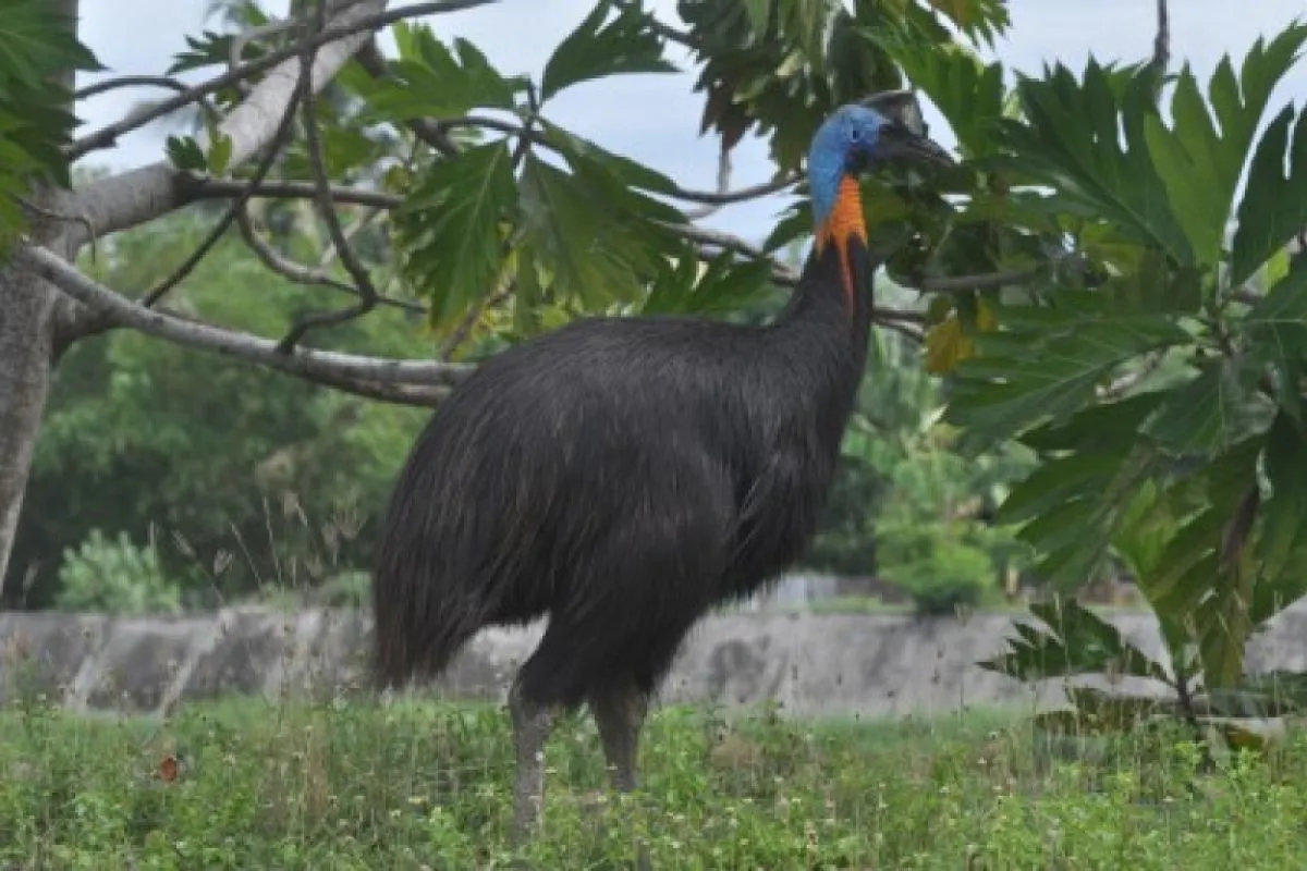 Seekor Burung Kasuari gelambir tunggal (Casuarius unappendiculatus) berkeliaran di kawasan Sungai Palu di Palu, Sulawesi Tengah, Kamis (23/1/2019). Keberadaan satwa dilindungi dengan tinggi sekitar satu meter dan berkeliaran di sekitar Sungai Palu itu menarik perhatian warga sekitar dan belum diketahui pasti penyebab munculnya burung tersebut pada tempat yang bukan habitatnya. ANTARA FOTO/Mohamad Hamzah/pras.