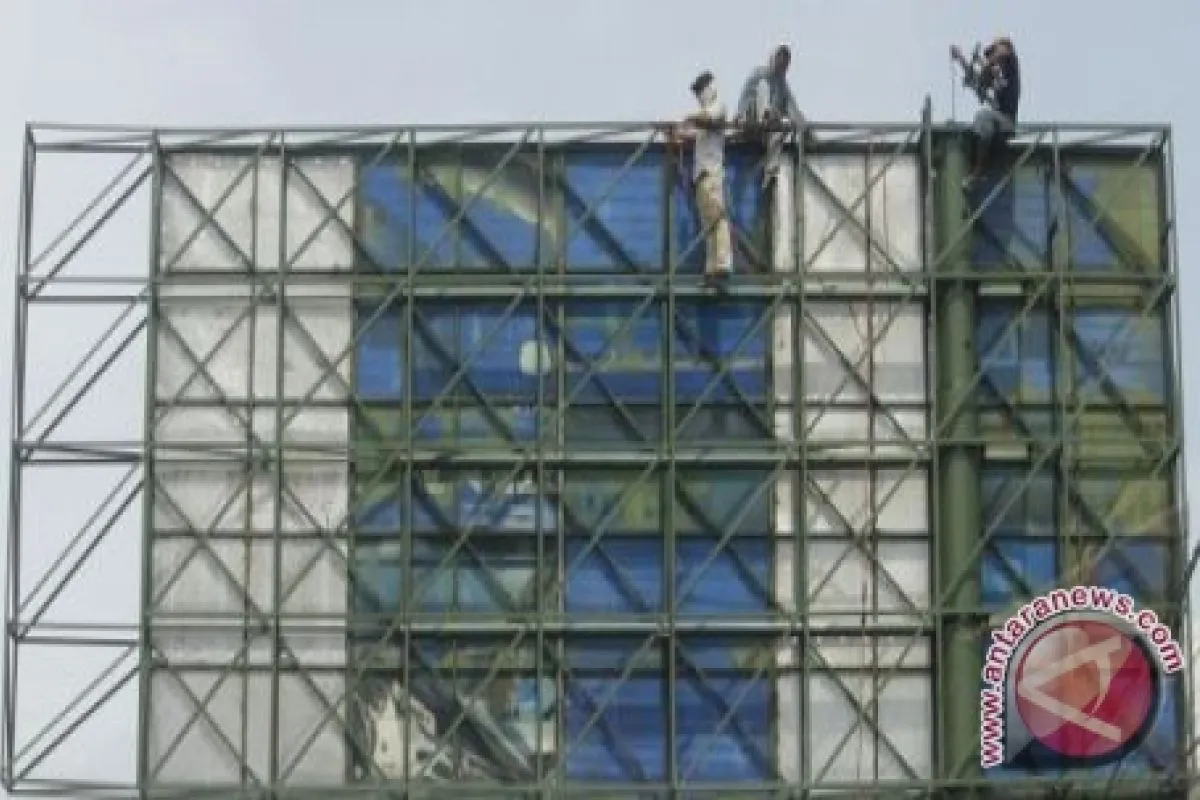 Pekerja memperbaiki papan iklan outdoor di Palur, Karanganyar, Jawa Tengah. Persatuan Perusahaan Periklanan Indonesia (P31) optimis dapat mencapai target belanja iklan pada 2012 sebesar Rp 90 triliun atau naik 23 persen dari tahun 2011. (ANTARA/Herka Yanis Pangaribowo)