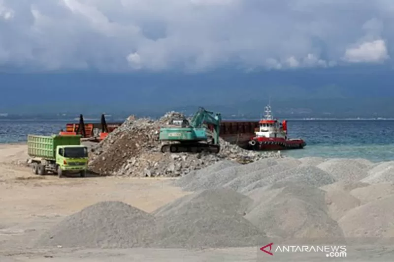 Sebuah alat berat menaikkan pasir, batu, dan kerikil (Sirtukil) ke dalam kapal tongkang di salah satu dermaga galain C Donggala, Sulawesi Tengah, Jumat (12/4/2019). Menurut asosiasi pertambangan setempat, permintaan hasil tambang galain C berupa sirtukil turun tajam mencapai 50 persen sejak 2019 karena sejumlah proyek infrastruktur pemerintah belum berjalan. ANTARA FOTO/Basri Marzuki/hp.