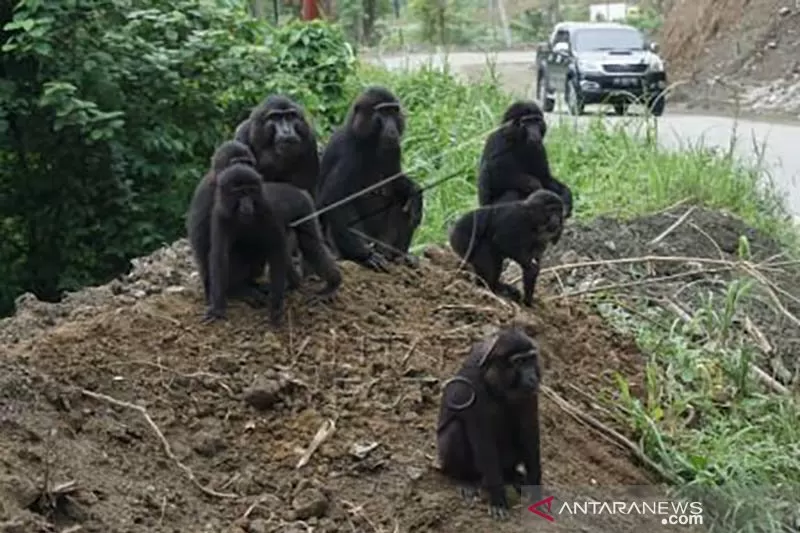 Pengendara berhenti di sekitar kawanan Kera hitam Sulawesi (Macaca tonkeana) yang berada di pinggir jalan jalur mudik poros Tawaeli-Toboli di Kawasan Pegunungan Kebun Kopi, Parigi Moutong, Sulawesi Tengah, Kamis (30/5/2019). Pemudik diimbau untuk tidak menyakiti, mengganggu dan berhati-hati saat melintas di lokasi kemunculan satwa tersebut. ANTARA FOTO/Mohamad Hamzah/aww.