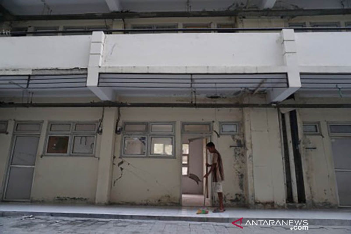 Petugas membersihkan rusunawa di Kayumalue, Palu Utara, Sulawesi Tengah, Jumat (14/6/2019). Sejak mengalami kerusakan akibat dilanda gempa pada 28 September 2018, rusunawa milik pemerintah tersebut sepi penghuni dan membutuhkan sejumlah perbaikan. ANTARA FOTO/Mohamad Hamzah/wsj.