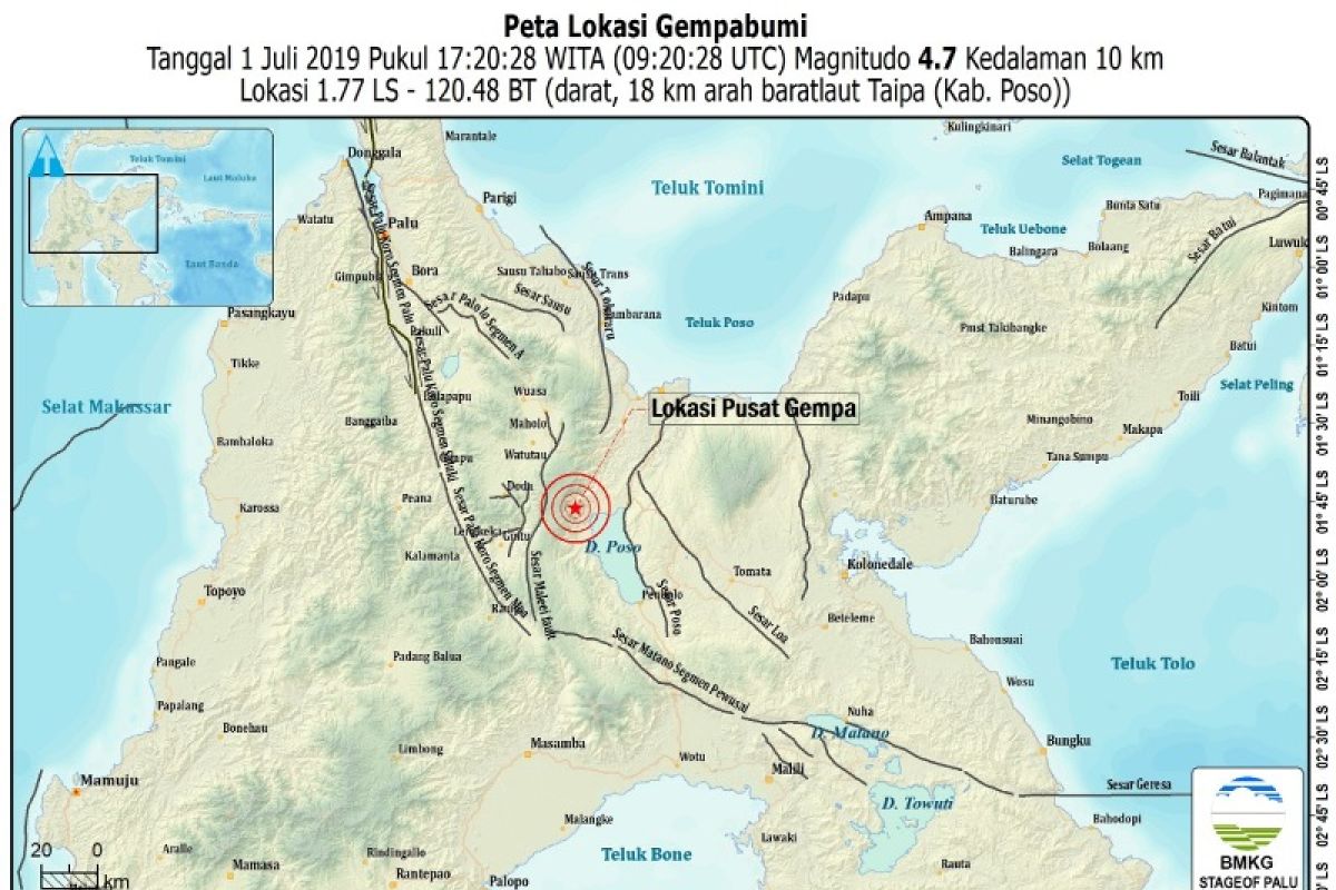 Dari rilis BMKG Stasiun Geofisika Palu, telah terjadi gempa dengan kekuatn 4.7 SC sekitar pukul 17.20 Wita, dengan pusat gempa bumi terletak pada koordinat 1.77 LS – 120.48 BT atau tepatnya arah barat laut Taipa, Kabupaten Poso, Sulawesi Tengah, pada kedalaman 10 KM.