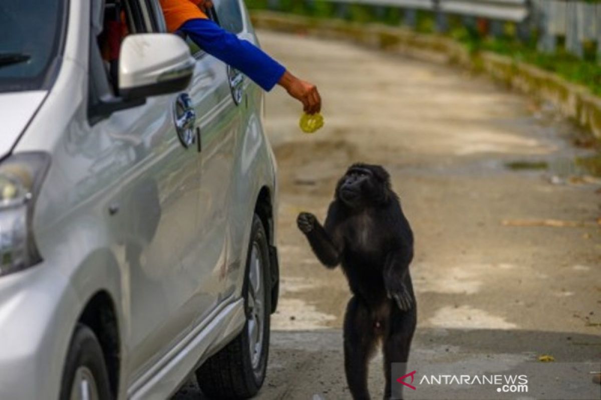 Seorang pengendara memberi makan ke seekor Kera Hitam Sulawesi (Macaca tonkeana) di ruas jalan kebun Kopi, Kabupaten Parigi Moutong, Sulawesi Tengah, Minggu (22/12/2019). Sejumlah warga masih memberi makan kera di jalan itu meski Balai Konservasi dan Sumber Daya Alam (BKSDA) setempat telah memasang larangan karena dapat mengubah perilaku satwa dilindungi itu. ANTARA FOTO/Basri Marzuki/foc.
